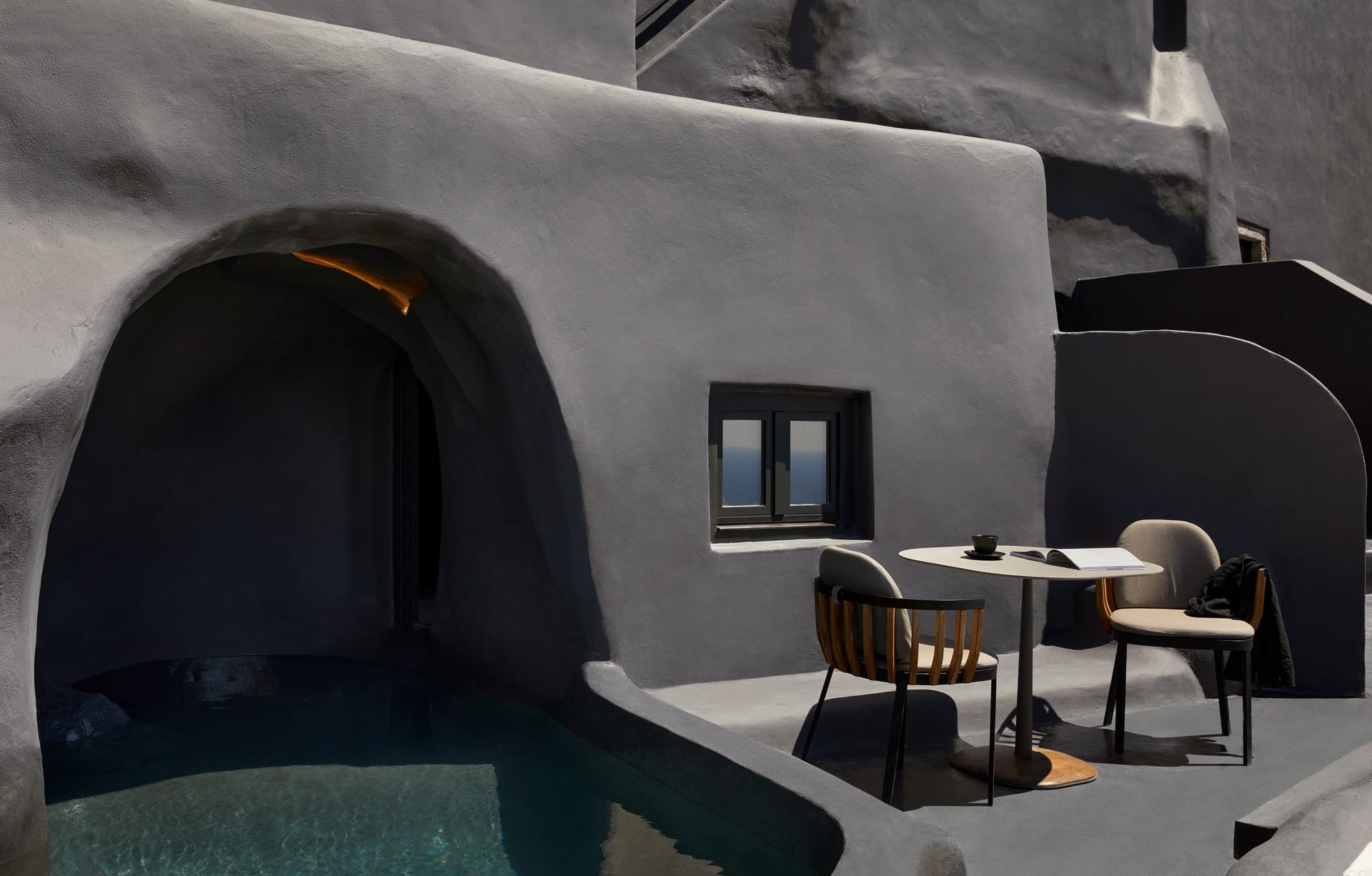 The Junior Suite promises an unforgettable romantic experience immersed in minimalist refinement and gorgeous views. Take advantage of your private terrace and soak up the glorious sun stretched out on your sunbeds, enjoy an al fresco candle lit dinner, and relax in your cave-style heated plunge pool as you gaze at the twinkling stars in the night sky. State-of-the-art amenities such as satellite TV, colour-changing lighting system, SONOS Bluetooth speakers and walk-in rain shower further enhance this luxurious accommodation, while the panoramic views of the volcanic caldera and majestic sunset add an unforgettable backdrop.